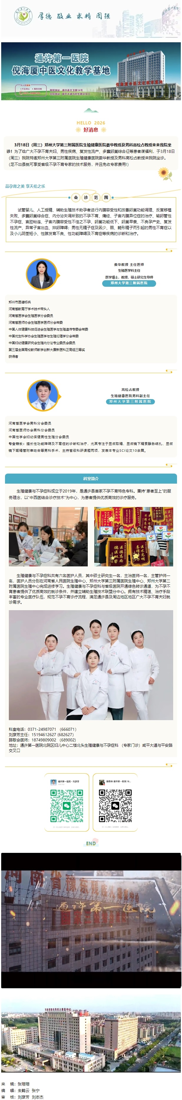 【好消息】3月18日郑州大学第三附属医院生殖健康医院娄华教授及男科高松占教授来我院坐诊!