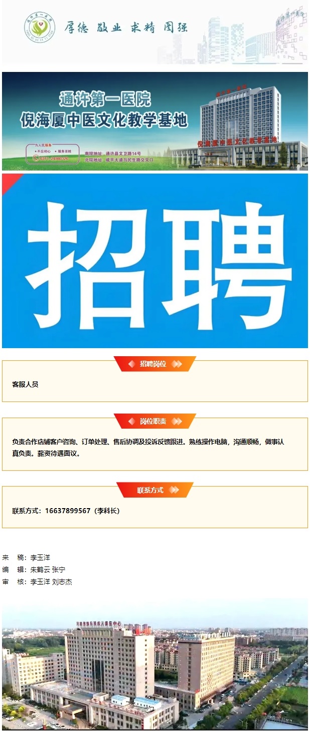 【招聘】通许第一医院面向社会公开招聘一名客服